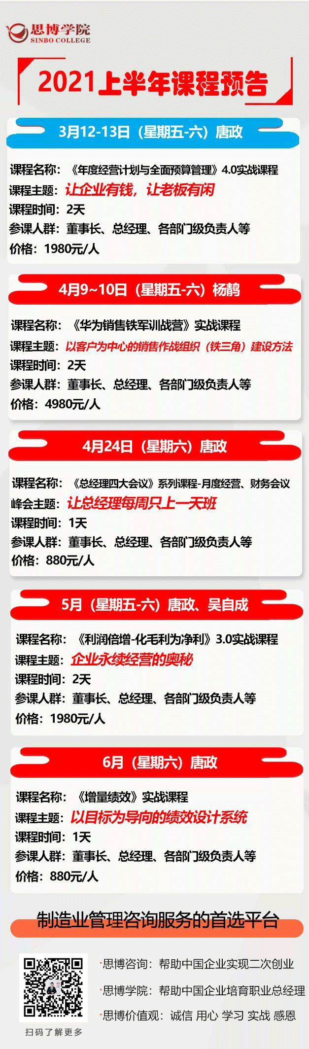 深圳市思博企業管理咨詢有限公司(sinbo) 是擁有多年管理實踐的實戰型管理咨詢企業,思博數十人的咨詢師團隊用近十年的時間潛心研究世界管理大師彼特·德魯克的目標管理及臺灣陳宗賢教授的企業經營計劃管理,同時深入日本、臺灣、歐美等知名企業學習先進管理理念及技能,結合中國企業本土化的特點,成功研究出一套適合中國國情的企業經營管理系統《企業年度經營計劃與全面預算管理》。該系統在思博團隊的潛心指導下,已成功幫助中國數百家企業實現年業績增長40%